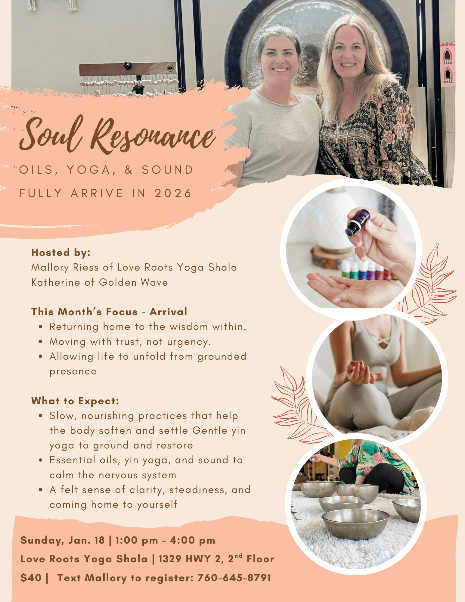 Hosted by Mallory Riess, yoga teacher and essential oil educator at Love Roots Yoga Shala & Katherine Matthews from Golden Wave, Sound Healer.